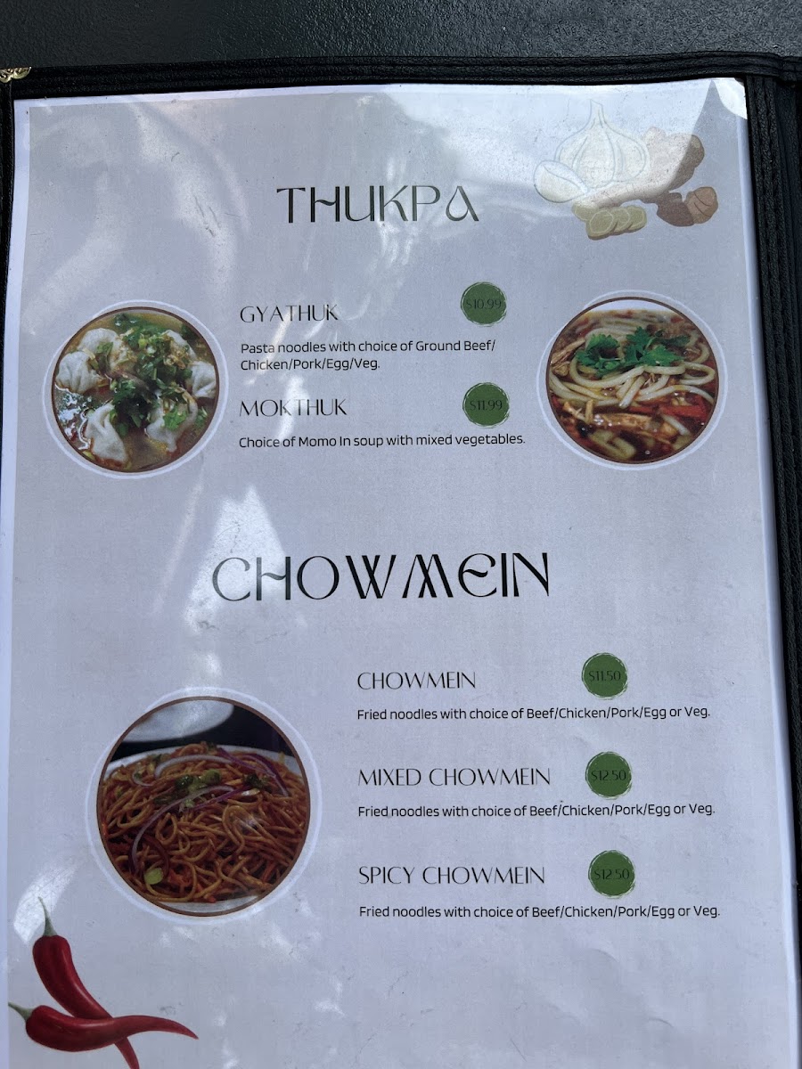 Hand pulled flat Tibetan pasta prepared in beef bone soup except veggie prepared in pure veggie broth.